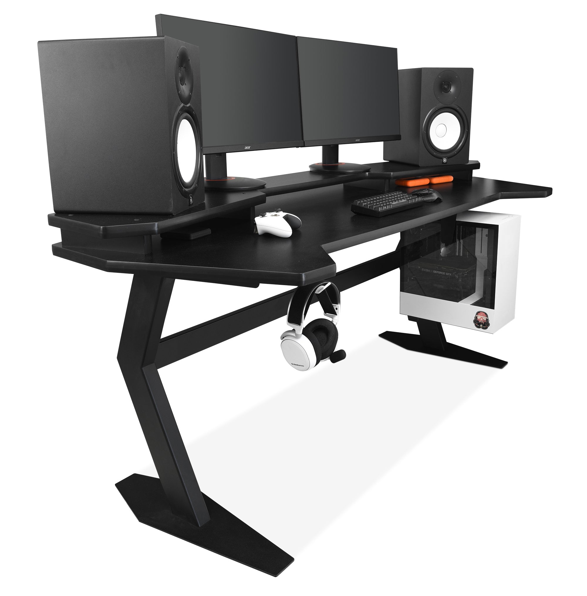 Enhance your gaming experience with the Commander Gaming Desk. Through its distinct cockpit-like design and unique shape and angles, this modern gaming desk allows for easily accessible accessories and gaming gear. The sleek top shelf allows for storage and follows the entire length of the desktop to provide plenty of room for your display monitors and speakers above it. Prefer a clean desktop surface? No problem. The top shelf is easily removable since it simply rests on top.